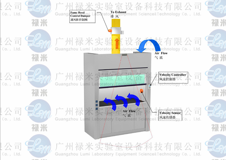 5、控制風(fēng)速功能:為防止通風(fēng)柜內(nèi)有害氣體逸出,需要有一定的吸入速度。決定通風(fēng)柜進(jìn)風(fēng)的吸入速度的要素有:實(shí)驗(yàn)內(nèi)容產(chǎn)生的熱量及與換氣次數(shù)的關(guān)系。其中主要的是實(shí)驗(yàn)內(nèi)容和有害物的性質(zhì)。通常規(guī)定,一般無毒的污染物為0.25~0.38m/s,有毒或有危險(xiǎn)的有害物為0.4~0.5m/s,劇毒或有少量放射性為0.5~0.6m/s,氣狀物為0.5m/s粒狀物為1m/s。為了確保這樣的風(fēng)速,排風(fēng)機(jī)應(yīng)有必要的靜壓,即空氣通過通風(fēng)管道時(shí)的摩擦阻力。確定風(fēng)速時(shí)還必須注意噪音問題,通過空氣在管道內(nèi)流動(dòng)時(shí)以7~10m為限,超過10m將產(chǎn)生噪音,通常實(shí)驗(yàn)室的室內(nèi)背景噪聲級(jí)噪聲限制值為70dBA,增加管道截面積會(huì)降低風(fēng)速也就降低噪音考慮到管道的經(jīng)費(fèi)和施工問題,必須慎重選擇管道及排風(fēng)機(jī)的功率。