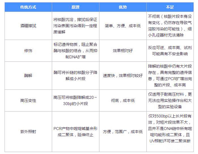 雖然這些污染對PCR實驗結(jié)果的影響已經(jīng)受到了廣泛重視,多數(shù)實驗室對污染控制都采取了各種辦法,比如定期大掃除清理、劃分操作區(qū)域、試劑分裝、操作謹(jǐn)慎、重復(fù)實驗、多角度驗證結(jié)果。但是微量的核酸片段就能被擴(kuò)增,所以對污染物的控制不僅僅是做到這些就能夠杜絕和避免的,關(guān)鍵是需要從源頭控制。目前多數(shù)生物試驗室,分子實驗每天都在大規(guī)模進(jìn)行,污染源已經(jīng)無處不在,特異性的,非特異性的,同源的,非同源的,廣泛分布在樣本容器、實驗室臺面,試劑溶液中、儀器表面內(nèi)管附著等等,你以為普通的清理就能解決這些污染源嗎?必須是不行的,實驗室大拿們都為了清除這些污染源研究出好多種方法,整理跟大家共享。