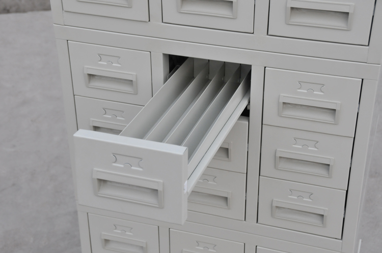 柜體采用1.0mm寶鋼冷軋鋼板。抽屜自動歸位功能,每套4組合,每組合9個抽屜,共36個抽屜,約放切片5.5~6萬片。柜體經(jīng)防銹處理,靜電噴塑工藝,整體美觀大方。最新利用槽式滑輪,起始點配高強度滑輪,抽屜推拉順暢,同時防止抽屜拉出來過長造成意外跌落。另配高彈性減震墊,可使抽屜關閉時減輕與柜體的碰撞,同時使噪音減少至最低限度。玻片柜